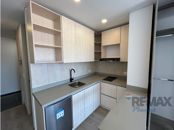 Cuenta con cocina abierta, gran capacidad de almacenamiento, nevera ejecutiva incluida, clóset amplio, mueble tipo multimedia con cajones y baño completo espacioso, con terminados de lujo.